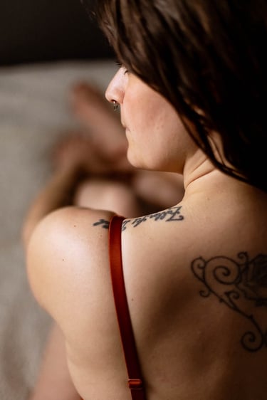 « J'ai voulu faire des photos avec toi car de base j'aime beaucoup ton travail, je trouve qu'il y a beaucoup de douceur dans chacune de tes photos. J'ai choisi le thème boudoir principalement pour avoir une autre image de mon corps, et quoi de mieux que des photos en jolie lingerie qui mettent en valeur un corps. J'en ai eu besoin car après une prise de poids à cause de ma dépression et du traitement qui va avec aujourd'hui j'ai beaucoup de mal à accepter mon apparence, et comme je te l'ai dit pendant le shooting je trouvais certaines photos belles, mais vu que je savais que c'était moi automatiquement je ne les aimais pas. Maintenant quand je les regarde j'arrive à les apprécier, et j'arrive à apprécier mon corps, et pour cela je t'en remercie »
